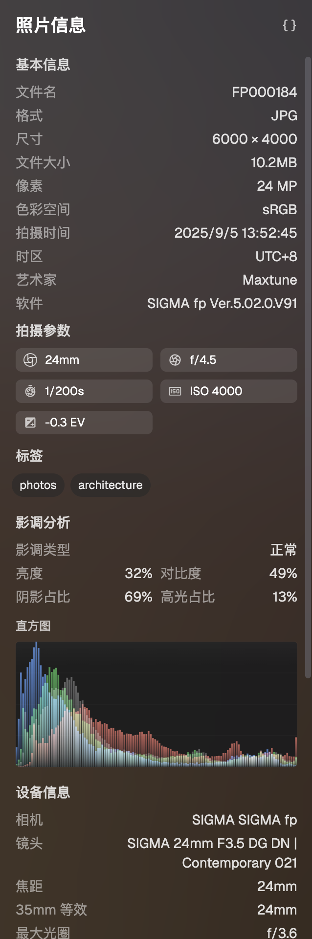 EXIF(Exchangeable Image File Format) 拍摄参数:快门速度、光圈、ISO、焦距 设备信息:相机品牌、型号、镜头信息 时间信息:拍摄时间、修改时间 GPS信息:经纬度、海拔 DPI信息