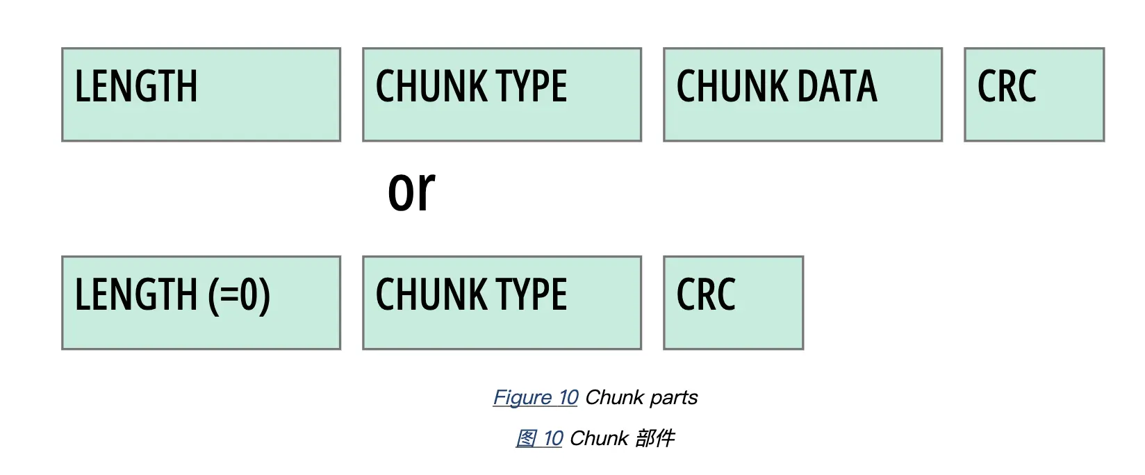 根据 PNG标准文档可以看到,PNG 有数据块的概念,一个图片数据有很多的 chunk 构成。